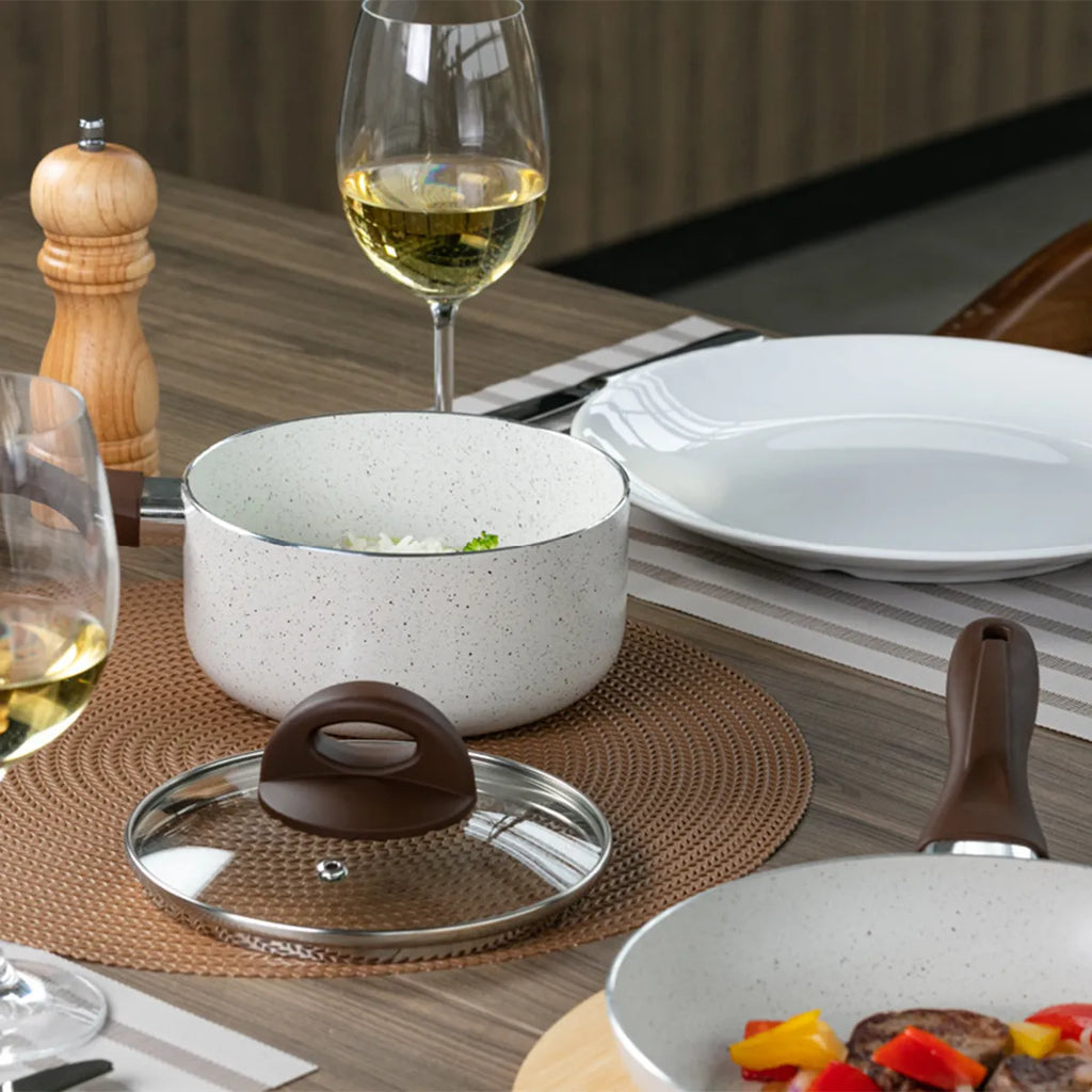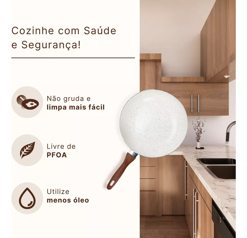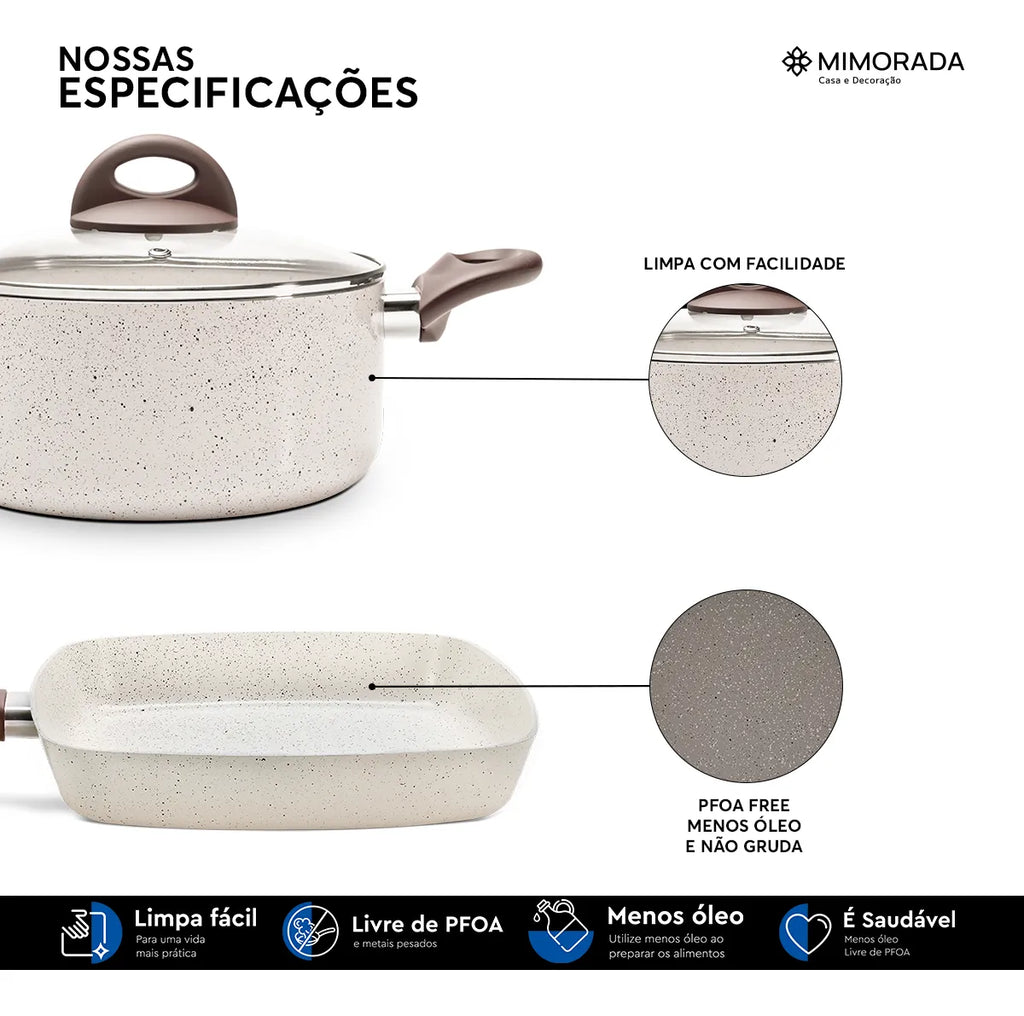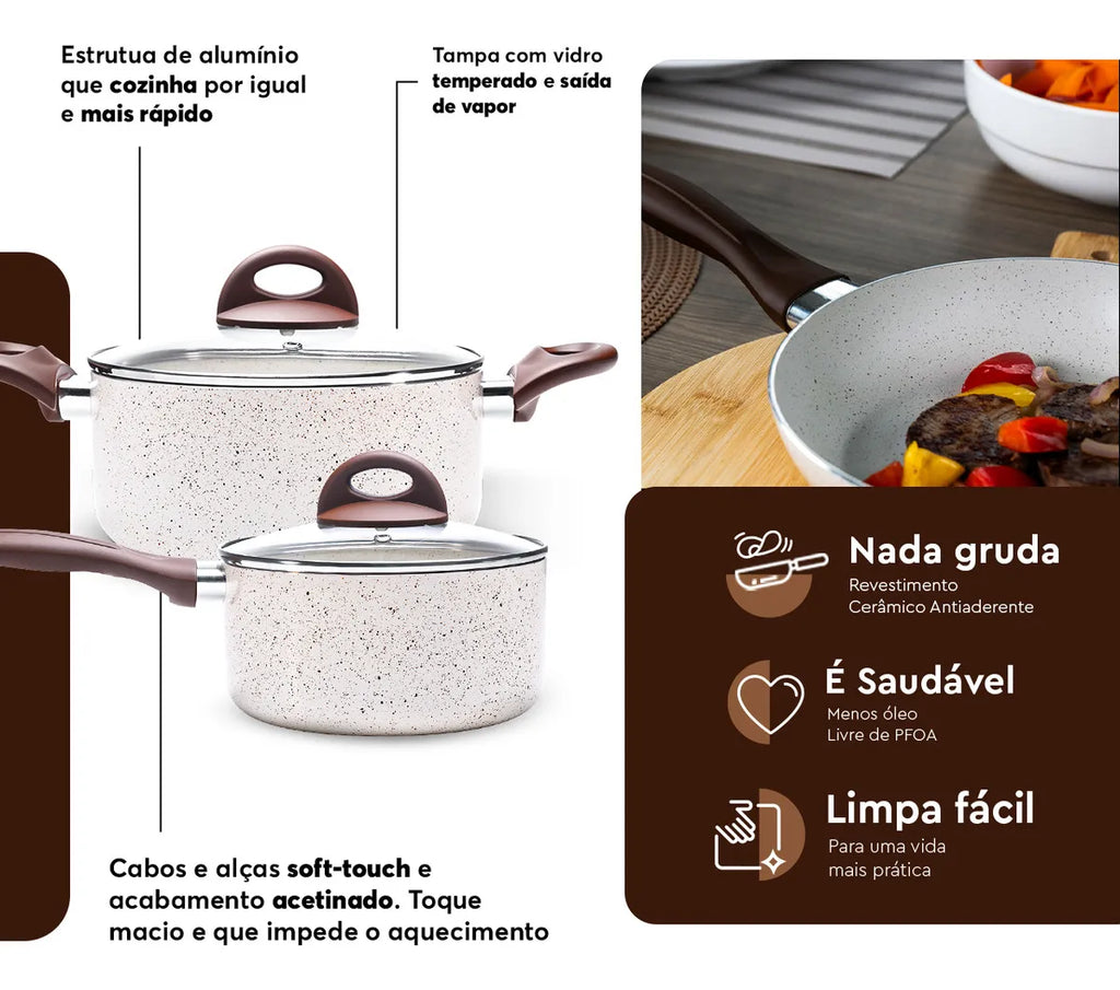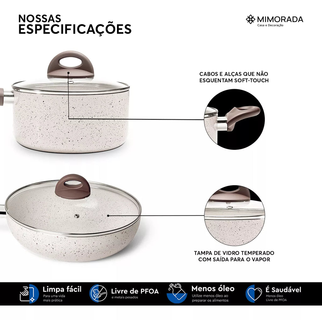 Produzidas com materiais de qualidade, essas panelas são ultra resistentes, proporcionando anos de uso confiável. A espessura de 2.5mm do alumínio garante uma distribuição uniforme do calor, garantindo um cozimento perfeito. Os cabos e alças têm revestimento soft-touch, oferecendo um toque macio e confortável, garantindo segurança e firmeza no manuseio.