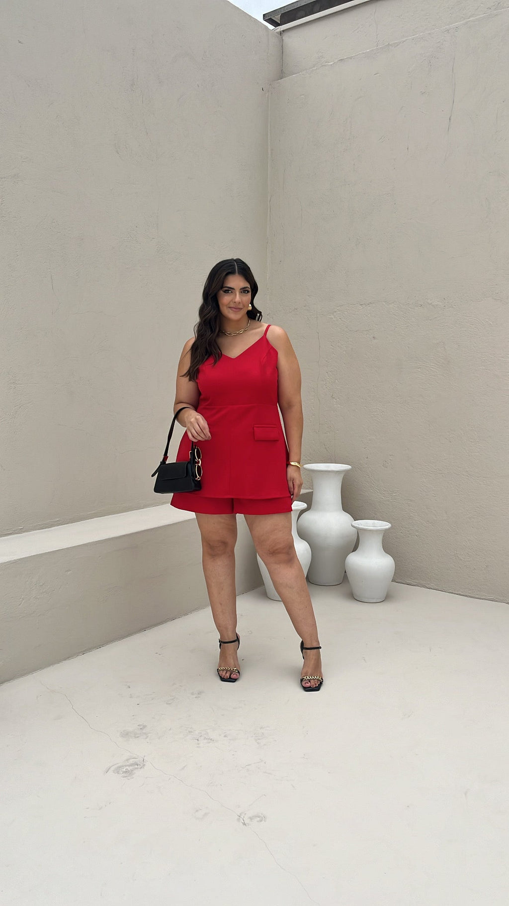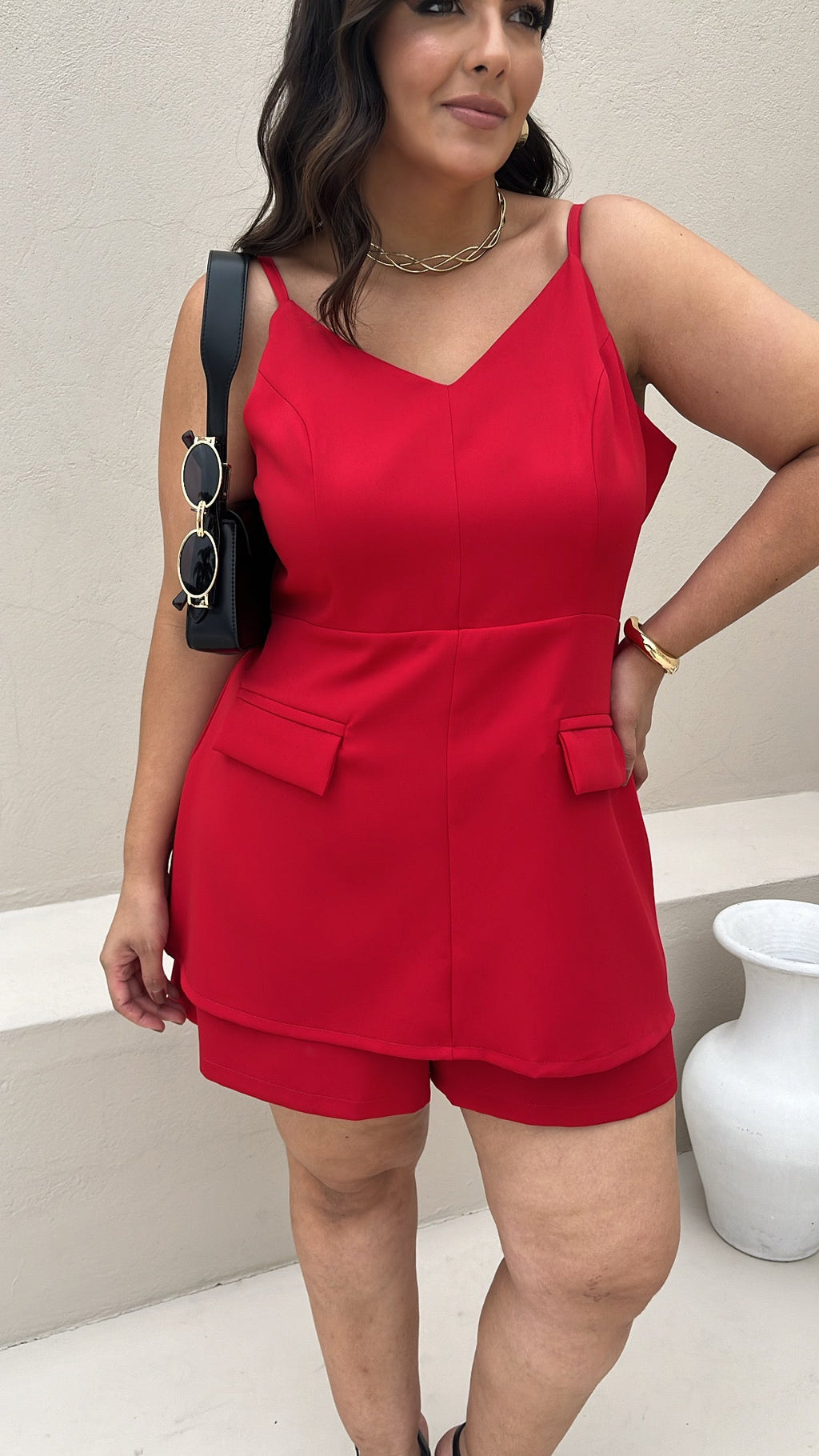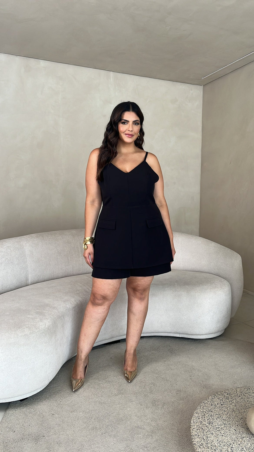 Modelagem pensada para nosso corpo com curvas Decote em V e alças finas reguláveis Detalhe em lapela frontal Recorte encima do shorts que parece um vestido Fechamento em zíper nas costas